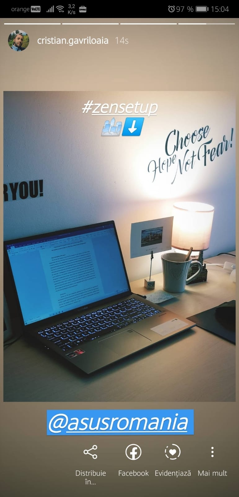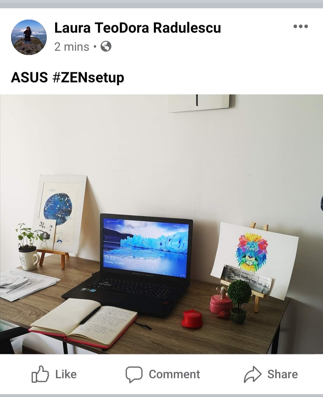 Cat de ZEN este spatiul unde lucrezi, studiezi sau te relaxezi zilnic, utilizand laptopul tau ASUS?: Ai un birou generos? Ti-ai amenajat balconul pentru studiu? Ai un spatiu special pentru sesiunile de gaming?