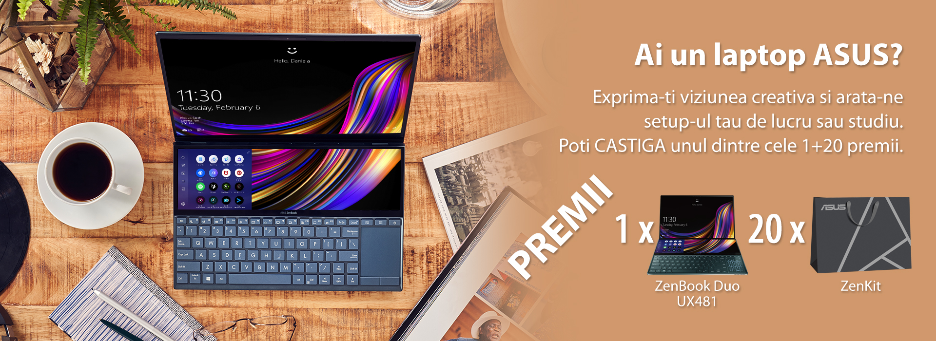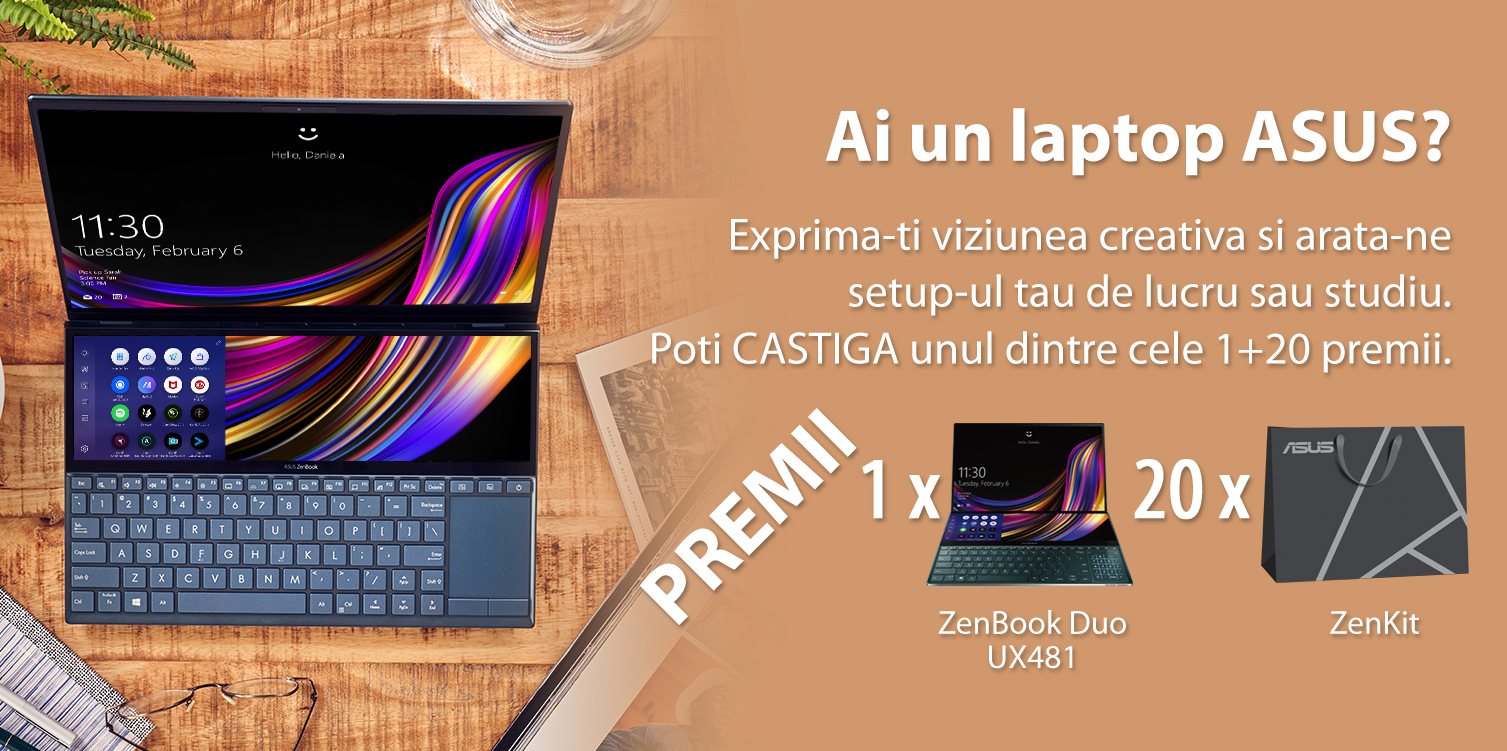 Poti castiga prin tragere la sorti Laptopul Viitorului - ASUS ZenBook Duo sau alte 20 ZenKit-uri pentru biroul tau.